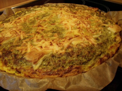 Na zrumienione ciasto wykładamy farsz, na górę kładziemy skrawki ciasta oraz tarkujemy odrobinę sera żółtego. Całość zapiekamy ok 30 minut. w temperaturze 180 st. do zrumienienia.